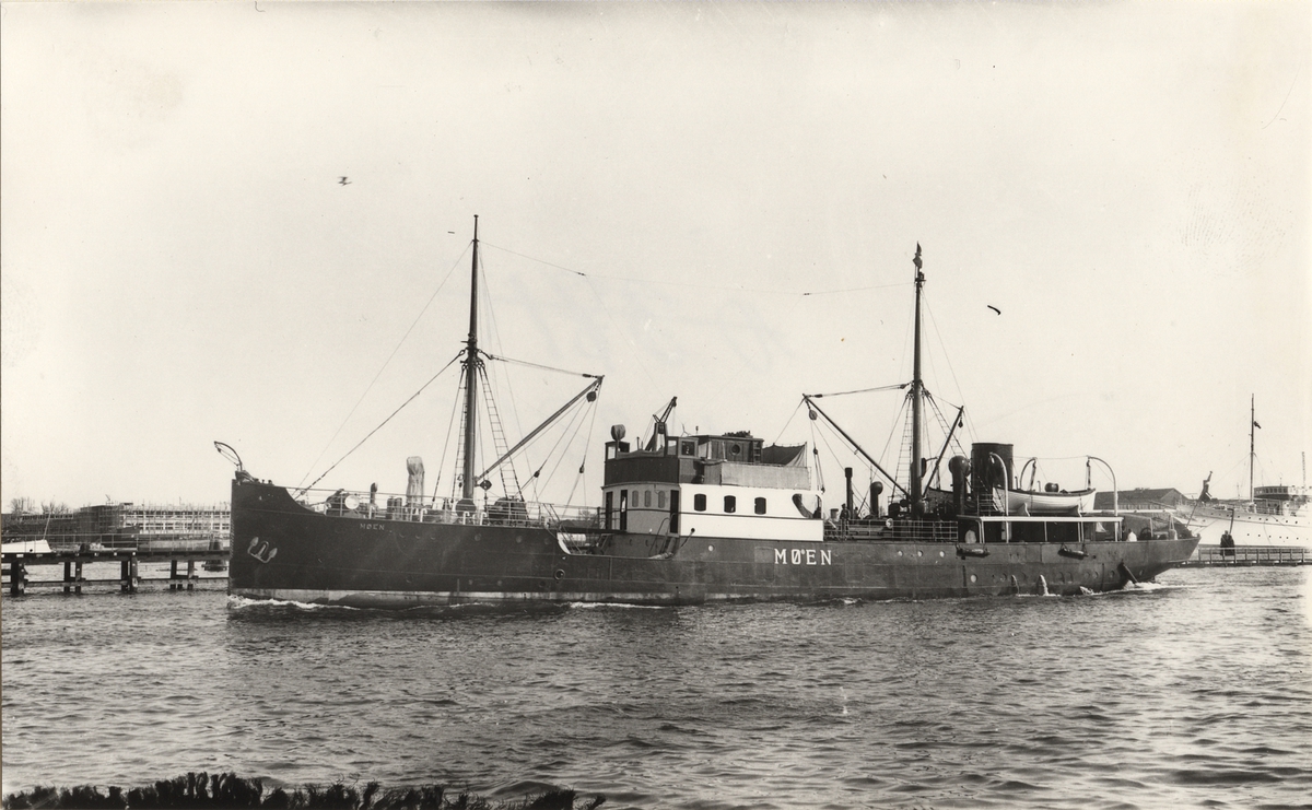 Foto i svartvitt visande lastmotorfartyget "MÖEN" av Svendborg i Köpenhamn under 1930-talet.