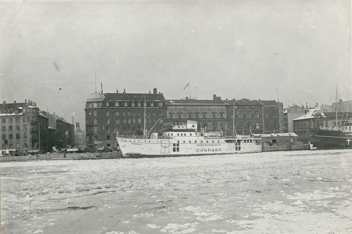 Foto i svartvitt visande passagerarmotorfartyget Nordbornholm vid kaj i Köpenhamn under 1939-1940-talet