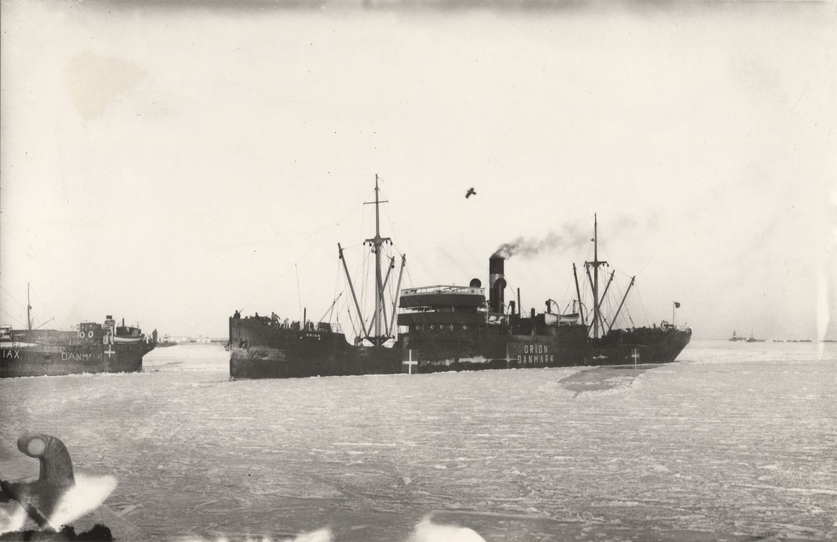 Foto i svartvitt visande lastångfartyget "ORION" av Köpenhamn, i Köpenhamn 1939-45.