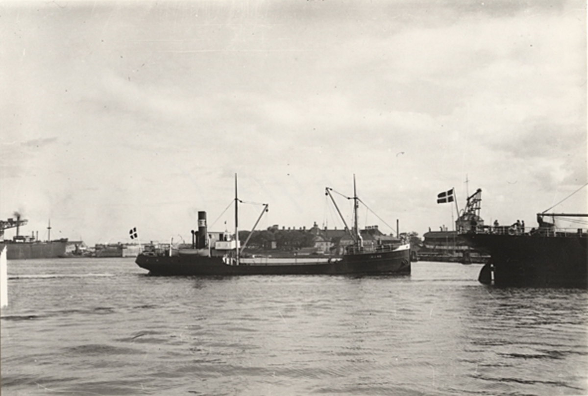 Foto i svartvitt visande lastångfartyget "HANS" av Köpenhamn i Köpenhamn i slutet av 1930-talet.