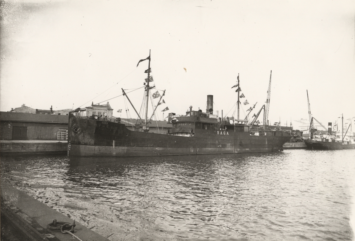 Foto i svartvitt visande lastångfartyget "SAGA" av Aarhus vid kaj i Köpenhamn, 1930-talet.