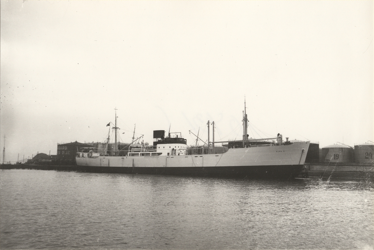 Foto i svartvitt visande lastmotorfartyget "OLGA S." av Köpenhamn vid kaj i Köpenhamn.