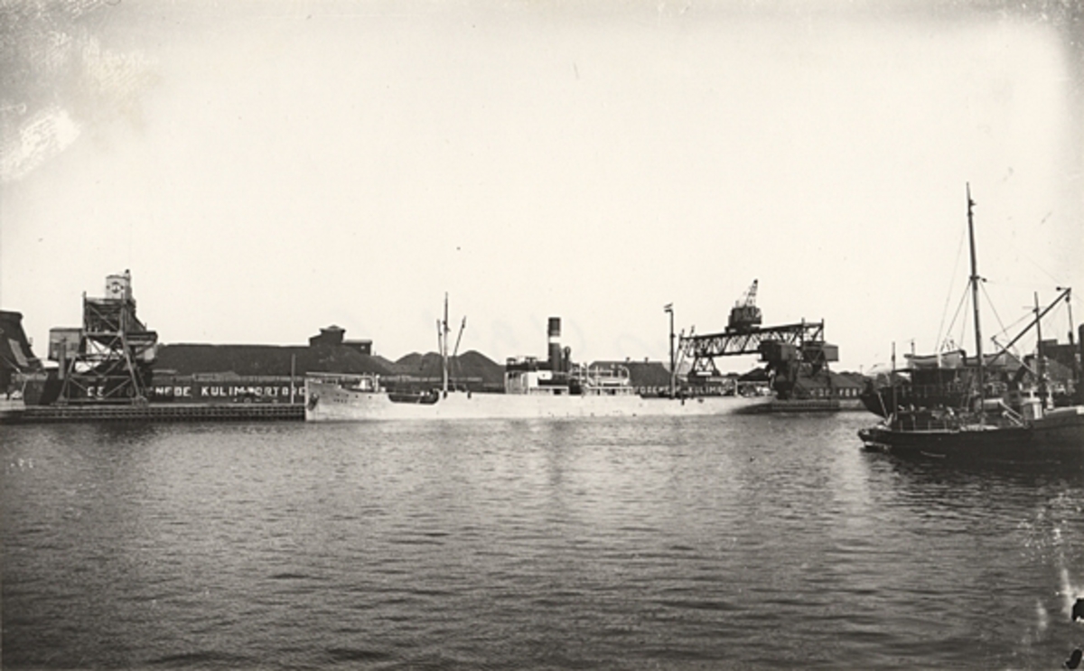 Foto i svartvitt visande lastångfartyget "ANNE" av Köpenhamn vid kaj i Köpenhamn.