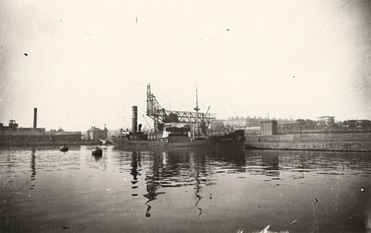 Foto i svartvitt visande lastångfartyget "HAFNIA" av Köpenhamn, vid kaj i Köpenhamn under 1930-talet.