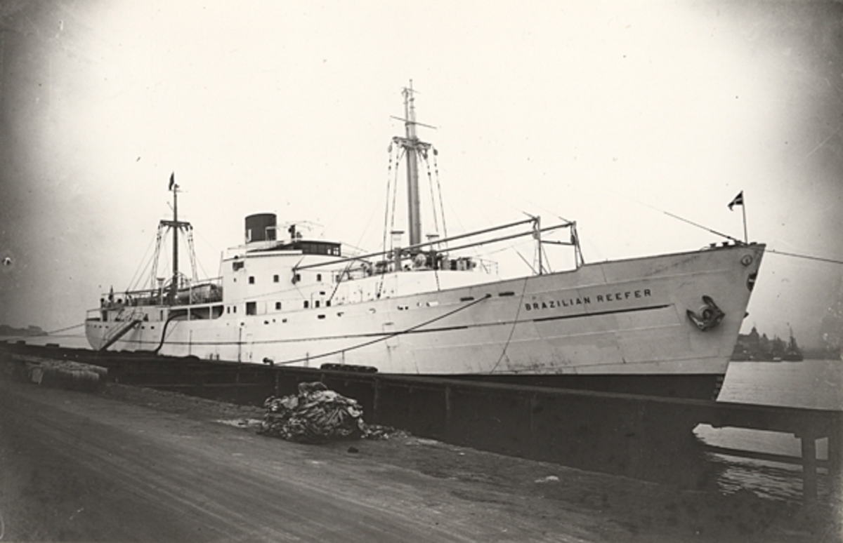 Foto i svartvitt visande lastmotorfartyget "BRAZILIAN REEFER" av Köpenhamn vid kaj i Köpenhamn under 1930-talets senare hälft.