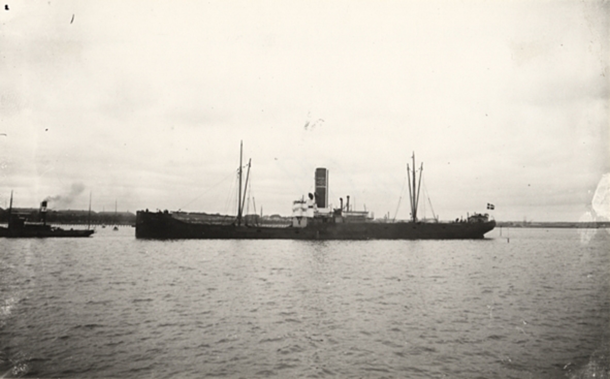 Foto i svartvitt visande lastångfartyget "CIMBRIA" av Köpenhamn i Köpenhamn under senare hälften av 1930-talet.