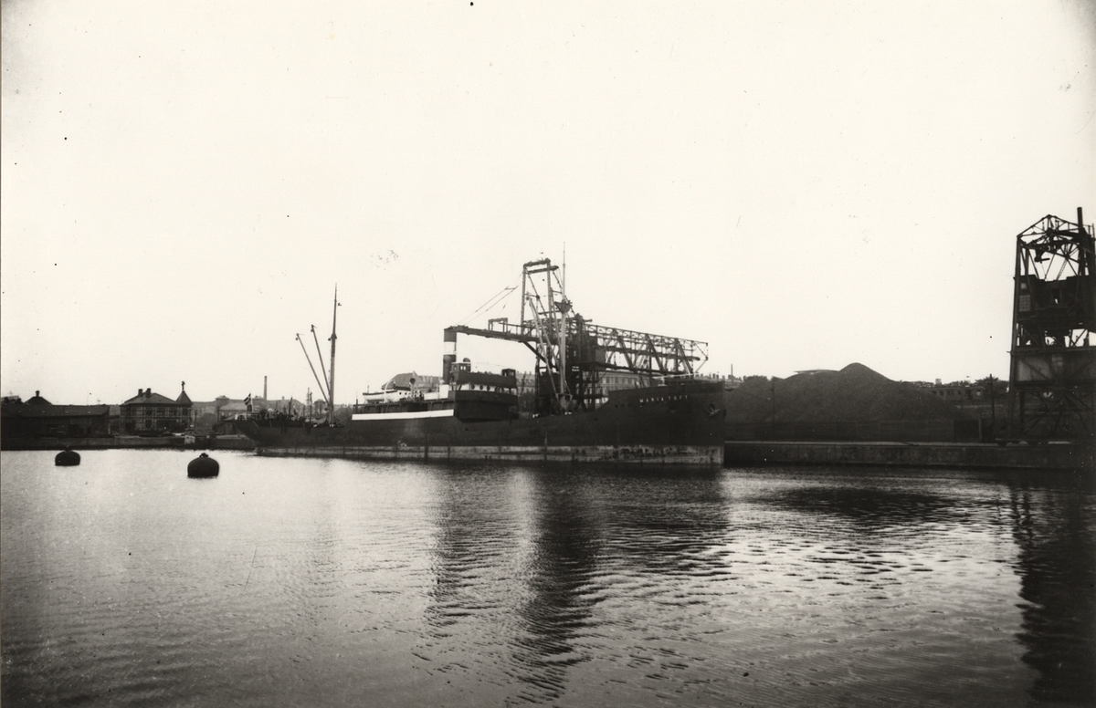 Foto i svartvitt visande lastångfartyget "MARIA TOFT" av Köpenhamn vid kaj i Köpenhamn under 1930-talet.