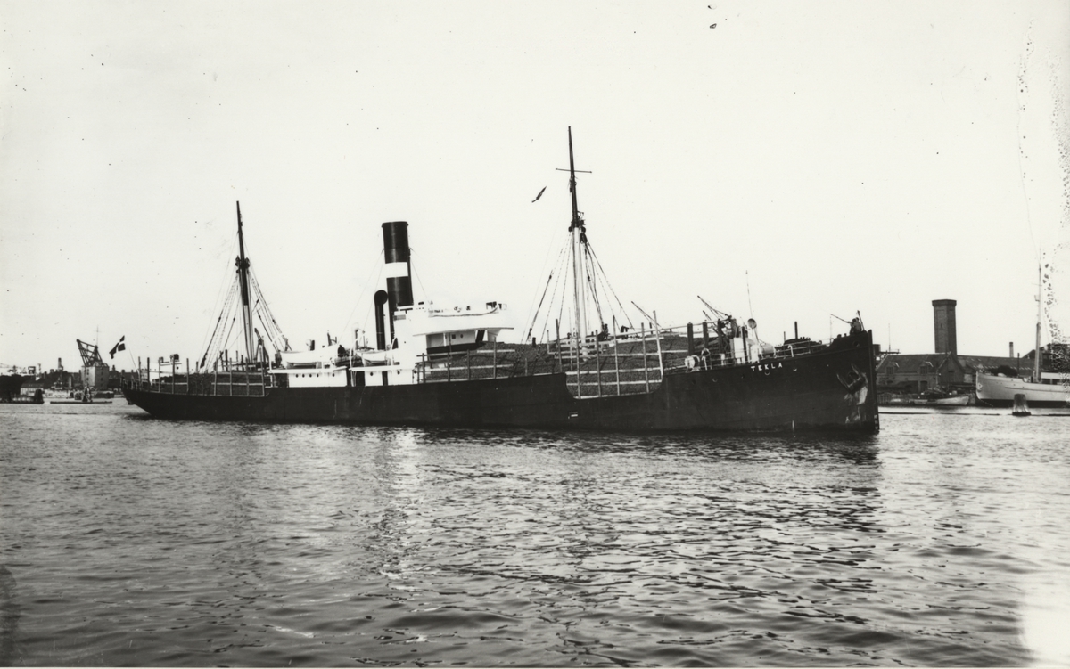 Foto i svartvitt visande lastångfartyget "TEKLA" av Köpenhamn i Köpenhamn, troligen under 1930-talet.