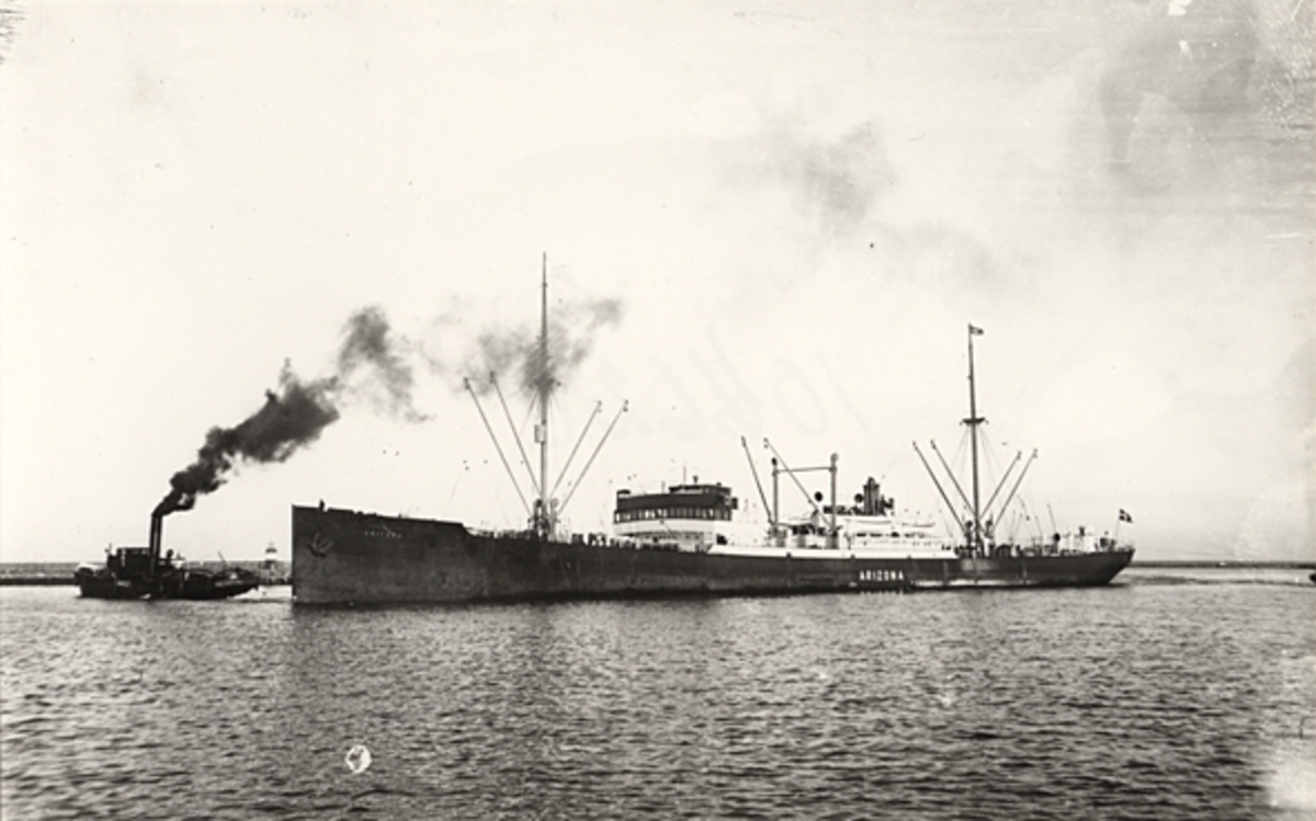 Titel: Foto i svartvitt visande lastmotorfartyget "ARIZONA" av Köpenhamn under bogsering i Köpenhamn, troligen 1930-talet.