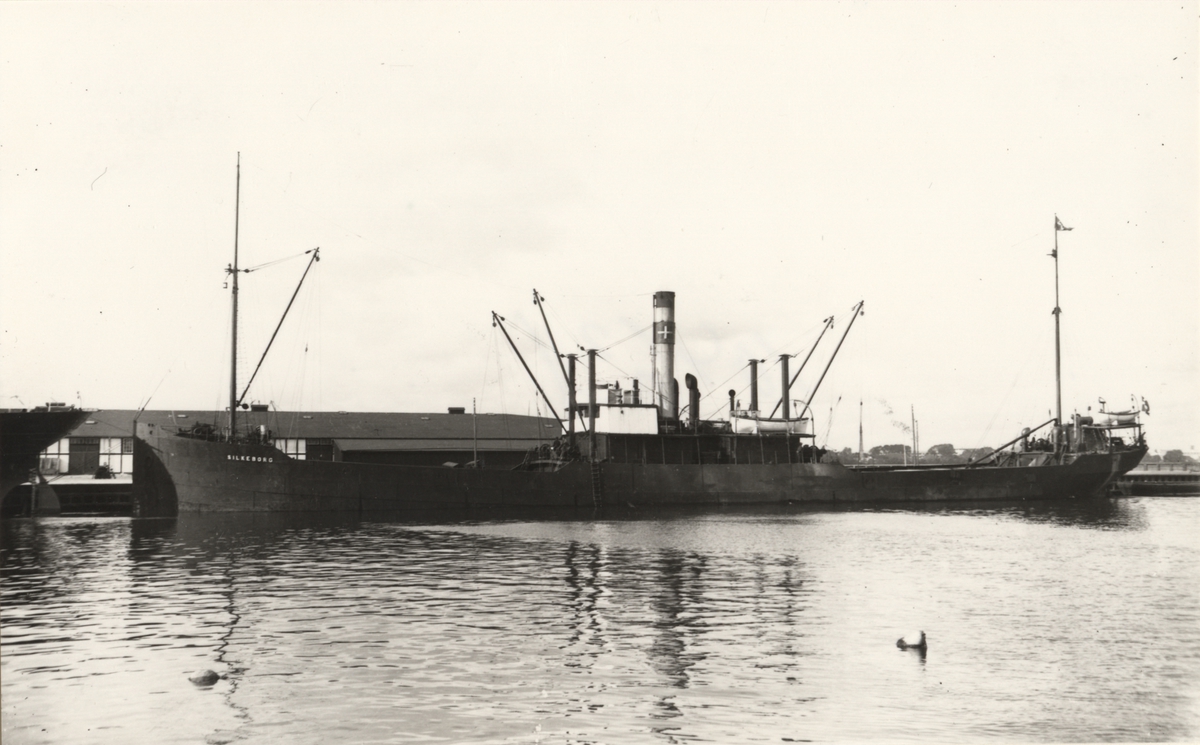 Foto i svartvitt visande lastångfartyget "SILKEBORG" av Köpenhamn, vid kaj i Köpenhamn, troligen under 1930-talet.