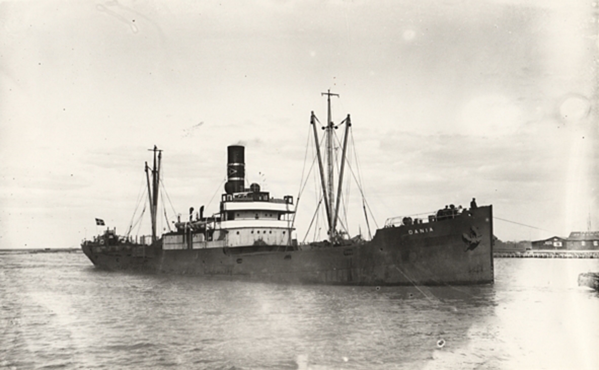 Foto i svartvitt visande lastångfartyget "DANIA" i Köpenhamn, troligen under 1930-talet.