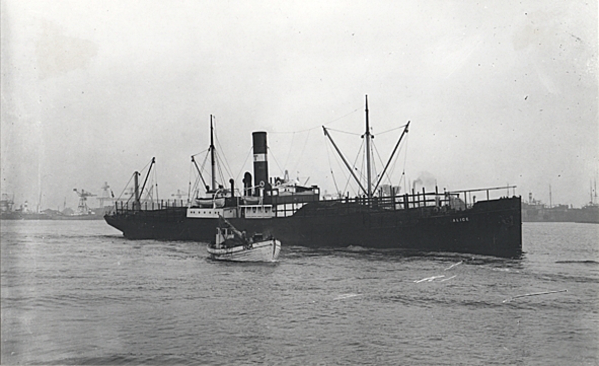 Foto i svartvitt visande lastångfartyget "ALICE" av Köpenhamn i Köpenhamn, troligen under 1930-talet.