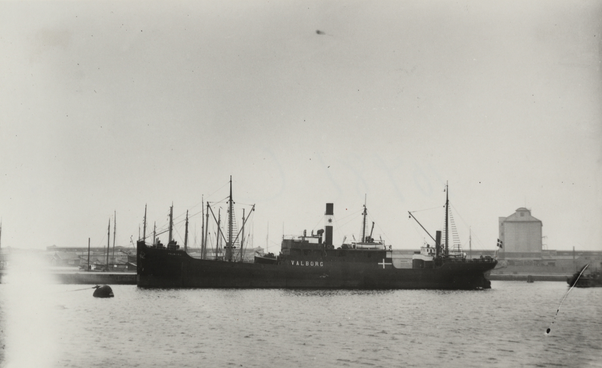 Foto i svartvitt visande lastångfartyget "VALBORG" av Köpenhamn, vid kaj i Köpenhamn under 1939-45.