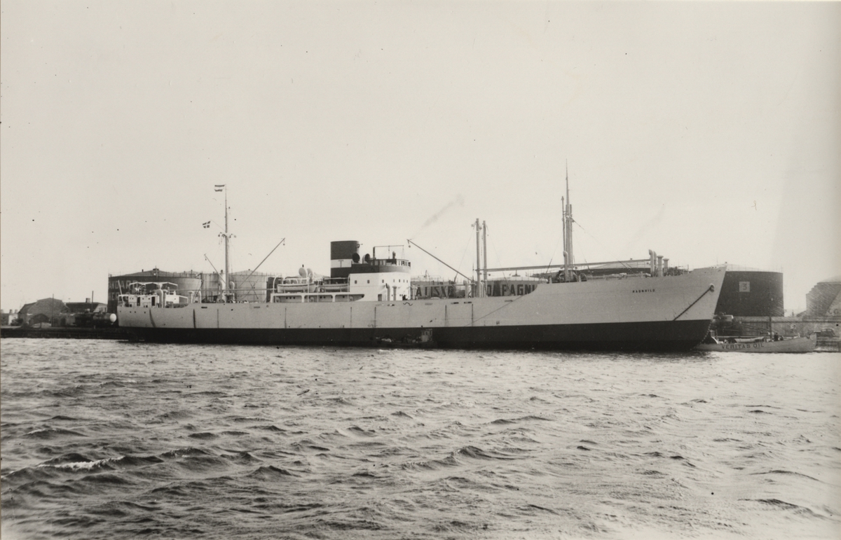 Foto i svartvitt visande lastmotorfartyget "RAGNHILD" av Köpenhamn, vid kaj i Köpenhamn under år 1939.