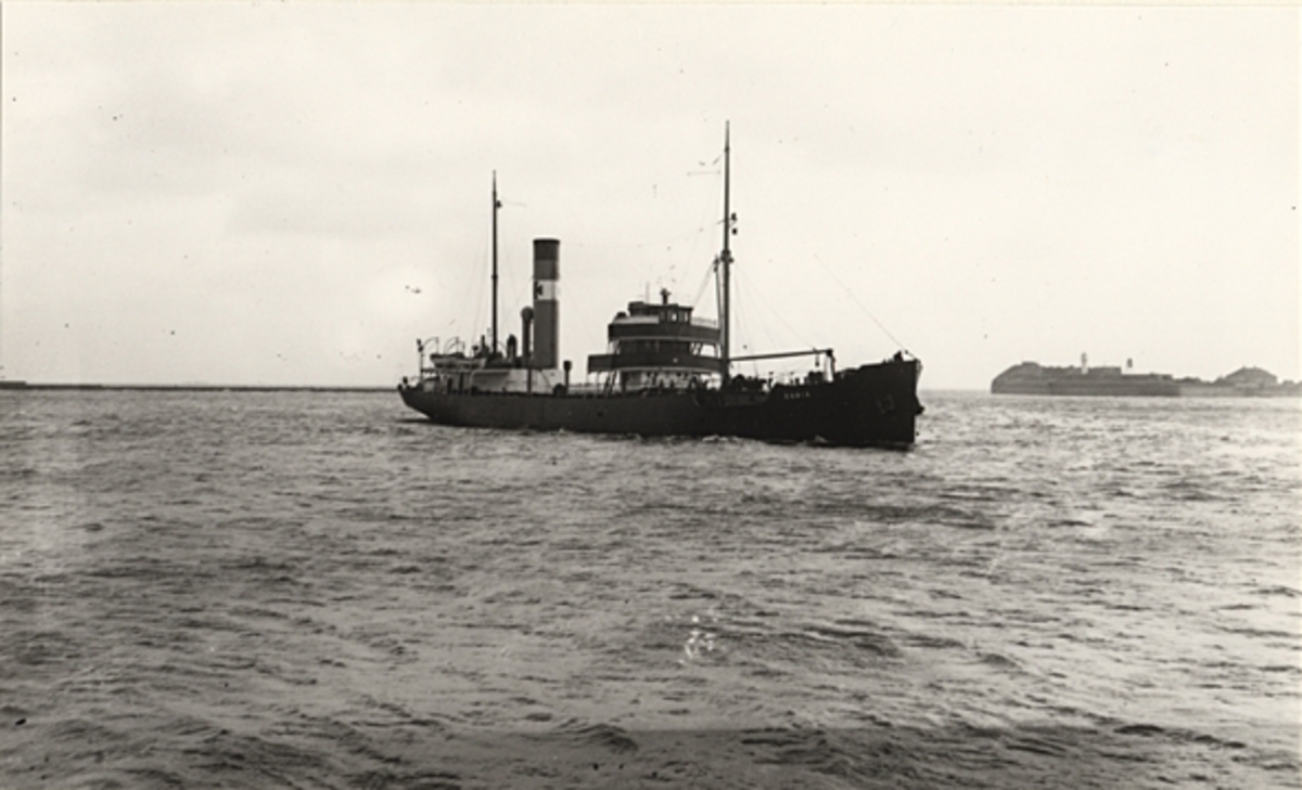 Foto i svartvitt visande tankångfartyget "DANIA" av Nyborg under gång i farvattnen kring Köpenhamn under 1930-talet.