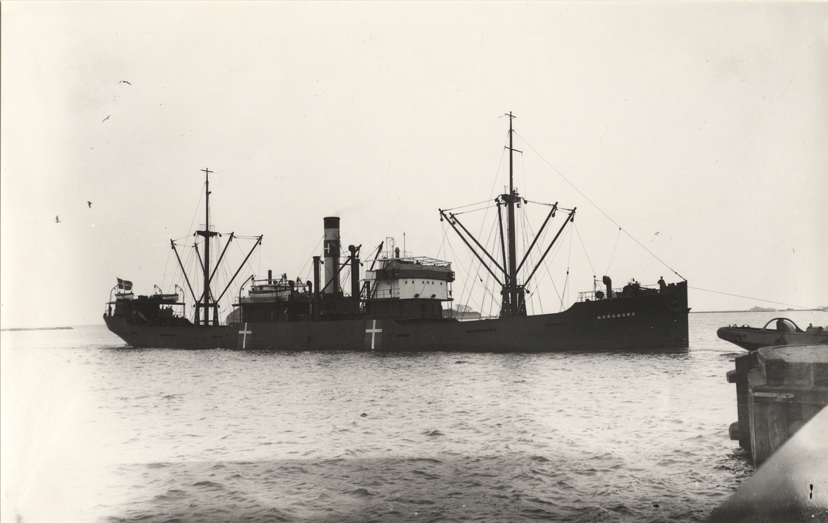 Foto i svartvitt visande lastångfartyget "NORDBORG" av Köpenhamn under bogsering i Köpenhamn under 1939-40.