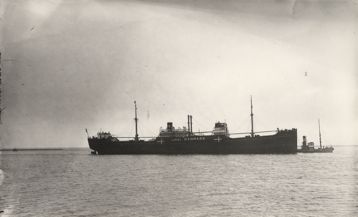 Foto i svartvitt visande lastmotorfartyget "LUNDBY" av Kalvehave i Köpenhamn under 1939-41.