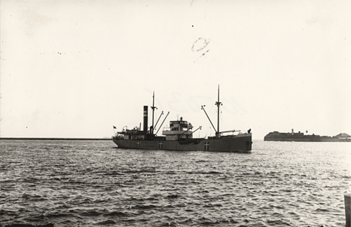 Foto i svartvitt visande lastångfartyget "DAGMAR CLAUSEN" av Odense i Köpenhamn under 1939-40.