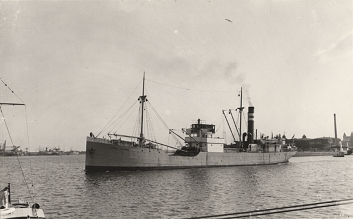 Foto i svartvitt visande lastångfartyget "DAGMAR CLAUSEN" av Odense i Köpenhamn under senare hälften av 1930-talet.