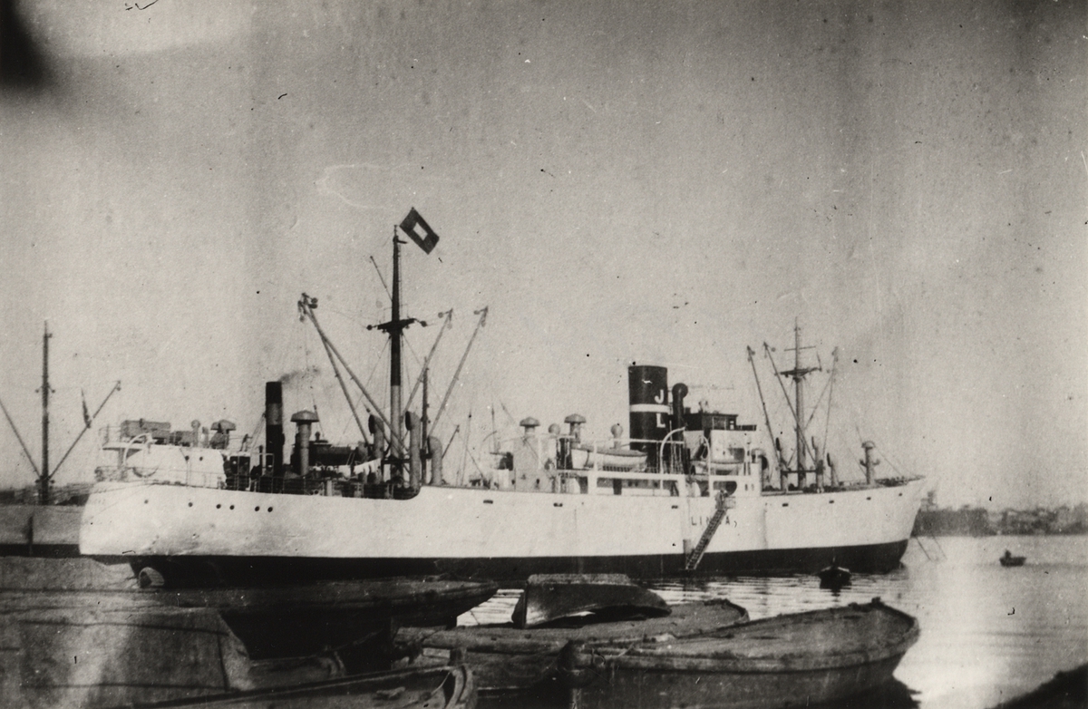 Foto i svartvitt visande lastångfartyget "LINDA" av Esbjerg i Köpenhamn, troligen under 1930-talets senare hälft.