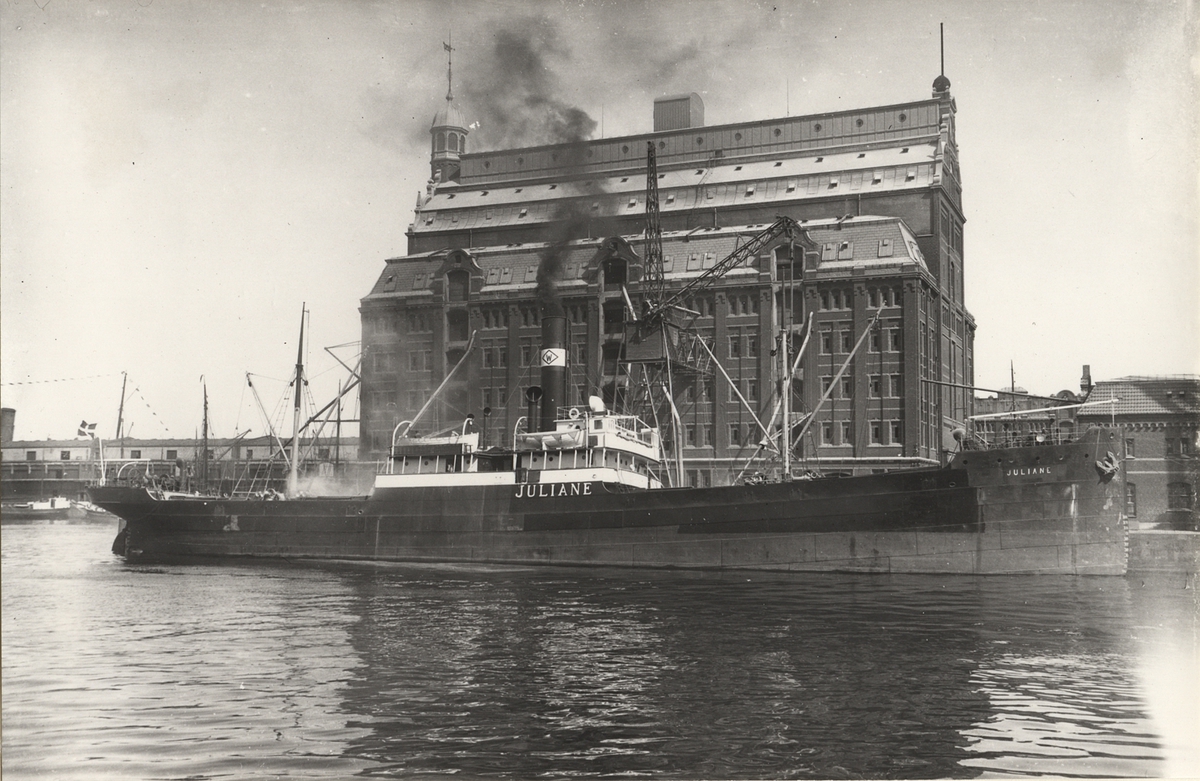 Foto i svartvitt visande lastångfartyget "JULIANE" av Fanö, vid kaj i Köpenhamn under 1930-talet.