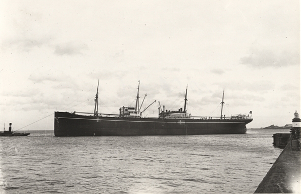 Foto i svartvitt visande lastmotorfartyget "AUSTRALIEN" av Köpenhamn under bogsering i Köpenhamn 1939 - 1940-talet.