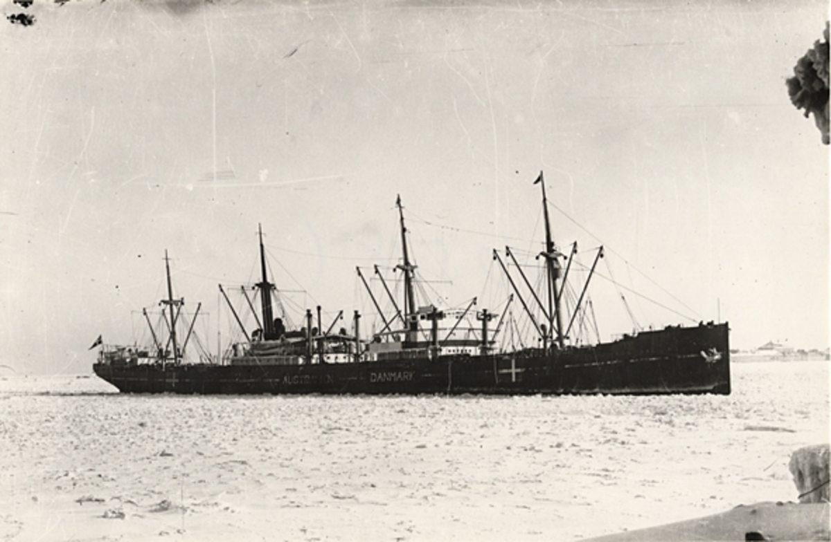 Foto i svartvitt visande lastmotorfartyget "AUSTRALIEN" av Köpenhamn i Köpenhamn 1939 - 1940-talet.