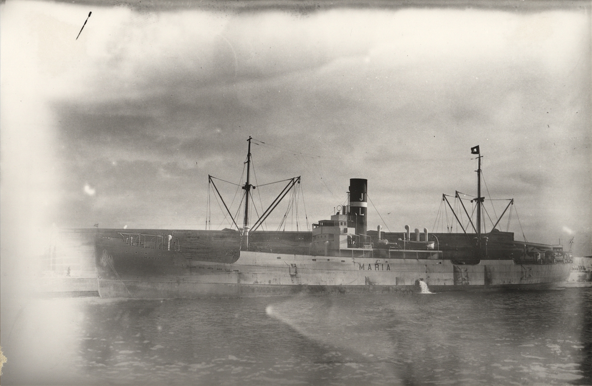 Foto i svartvitt visande lastångfartyget "MARIA" av Esbjerg vid kaj i Köpenhamn, 1938-40.