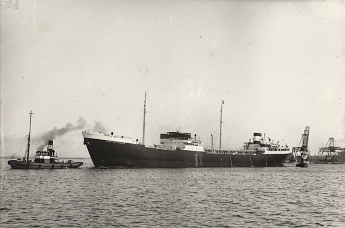 Foto i svartvitt visande tankmotorfartyget "ESSO COPENHAGEN" av Panama i Köpenhamn.