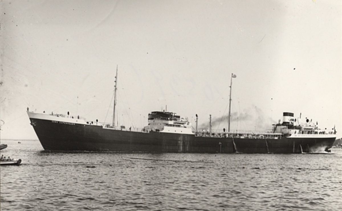 Foto i svartvitt visande tankmotorfartyget "ESSO COPENHAGEN" av Panama i Köpenhamn.