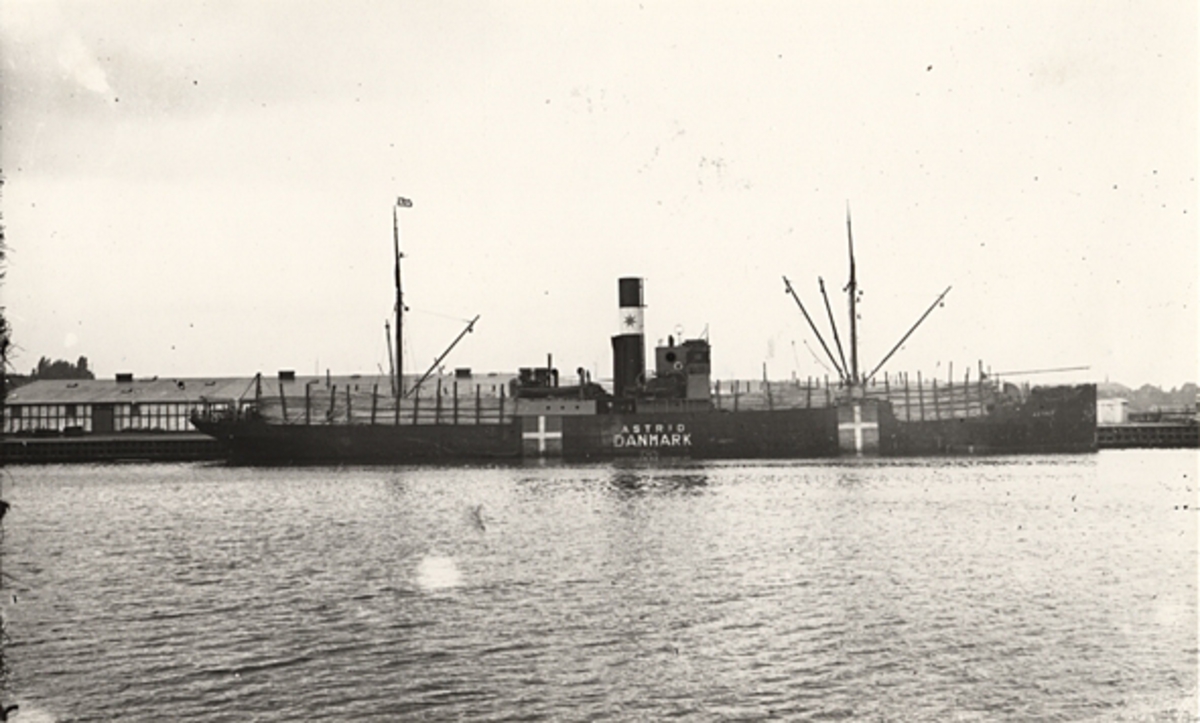 Foto i svartvitt visande lastångfartyget "ASTRID" av Köpenhamn, vid kaj i Köpenhamn under 1939 - 1940-talet.