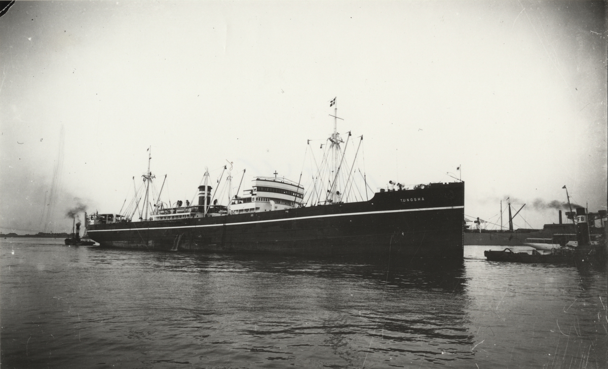 Foto i svartvitt visande lastmotorfartyget "TUNGSHA" av Tönsberg i Köpenhamn under 1930-talet.