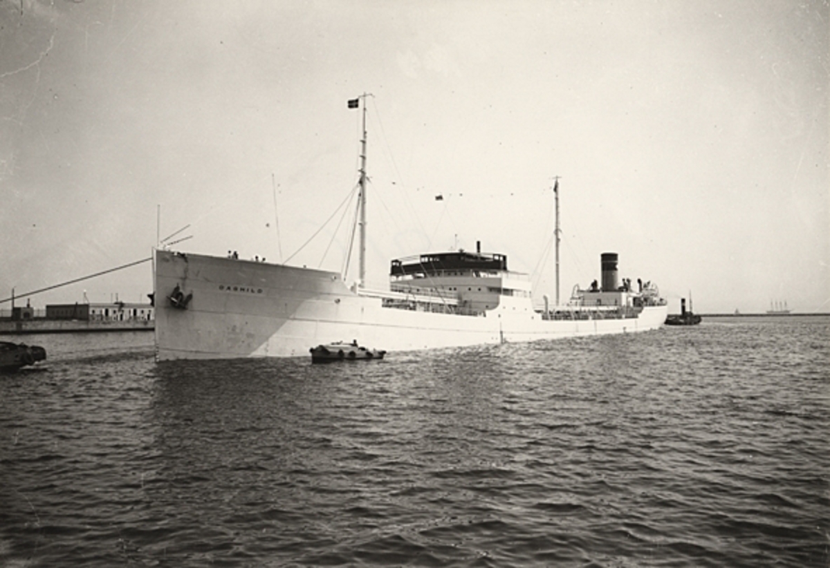 Foto i svartvitt visande tankmotorfartyget "DAGHILD" av Oslo under bogsering i Köpenhamn, troligen under 1930-talet.
