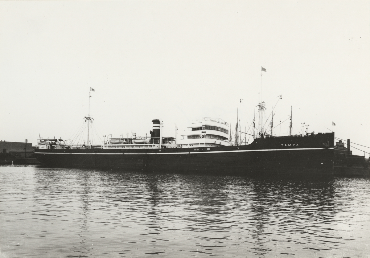 Foto i svartvitt visande lastmotorfartyget "TAMPA" av Tönsberg vid kaj i Köpenhamn under 1930-talet.