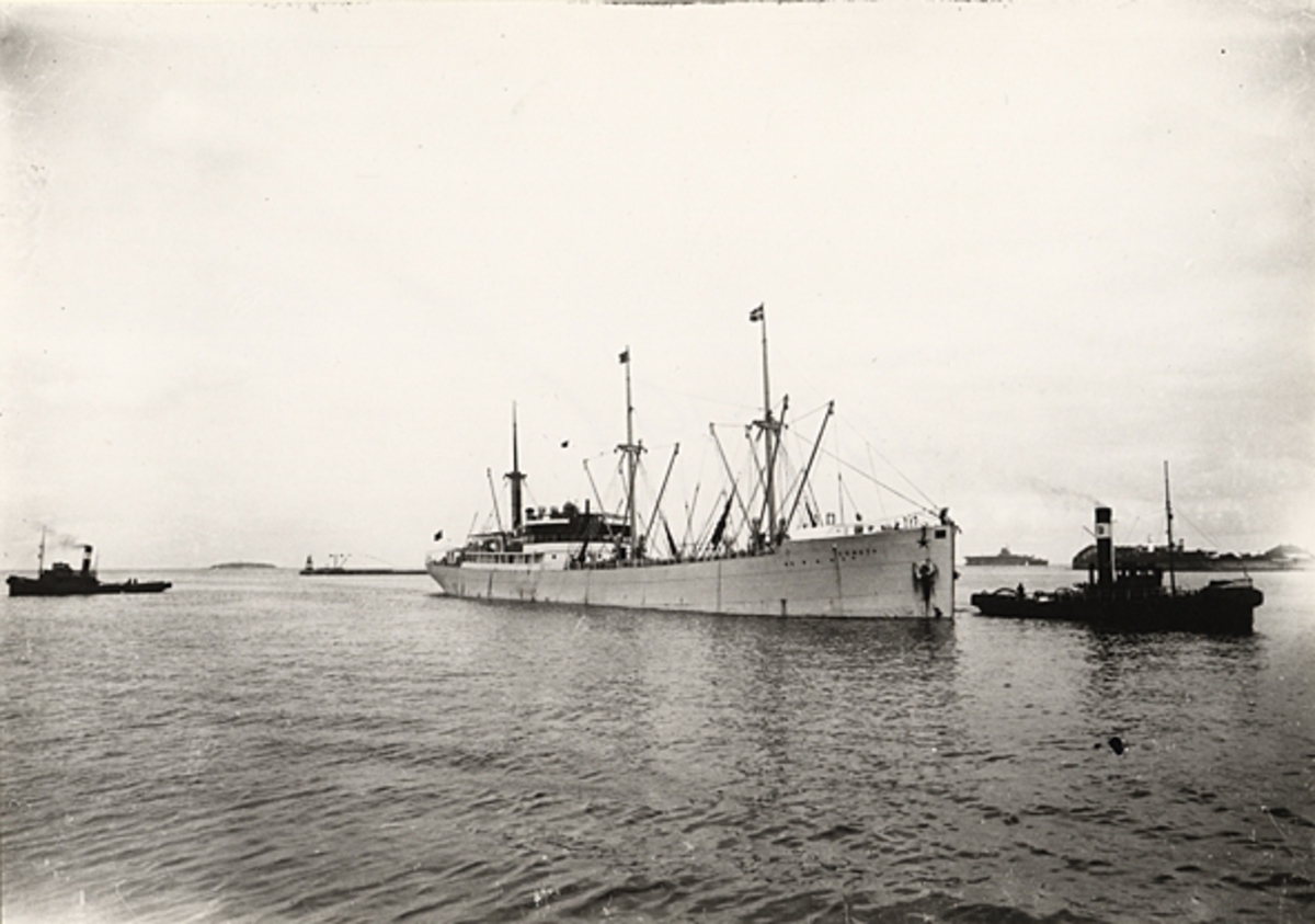 Foto i svartvitt visande lastmotorfartyget "COMETA" av Bergen under bogsering i Köpenhamn under 1930-talet.