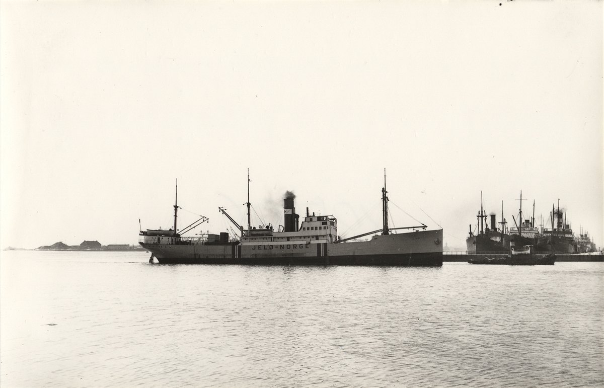 Foto i svartvitt visande lastångfartyget "JELÖ" av Oslo under bogsering i Köpenhamn 1939-45.