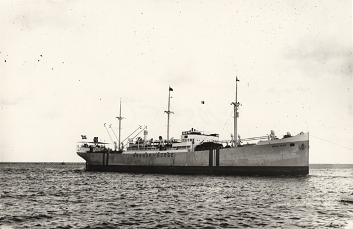 Foto i svartvitt visande lastmotorfartyget "BRA-KAR" av Oslo under bogsering i Köpenhamn 1939-40.