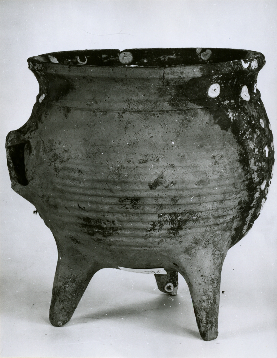 Trefotsgryta av rött lergods, invändigt glaserad, utvändigt räfflad, med handtaget avslaget. Innehåll: en talgklump. Sjöfynd från Djurhamn.