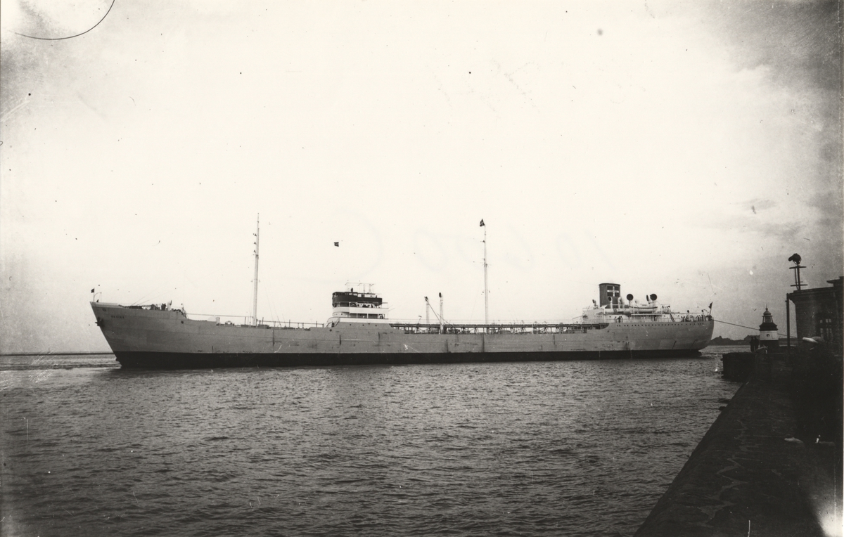 Foto i svartvitt visande tankmotorfartyget "REGINA" av Kristiansand i Köpenhamn under slutet av 1930-talet.