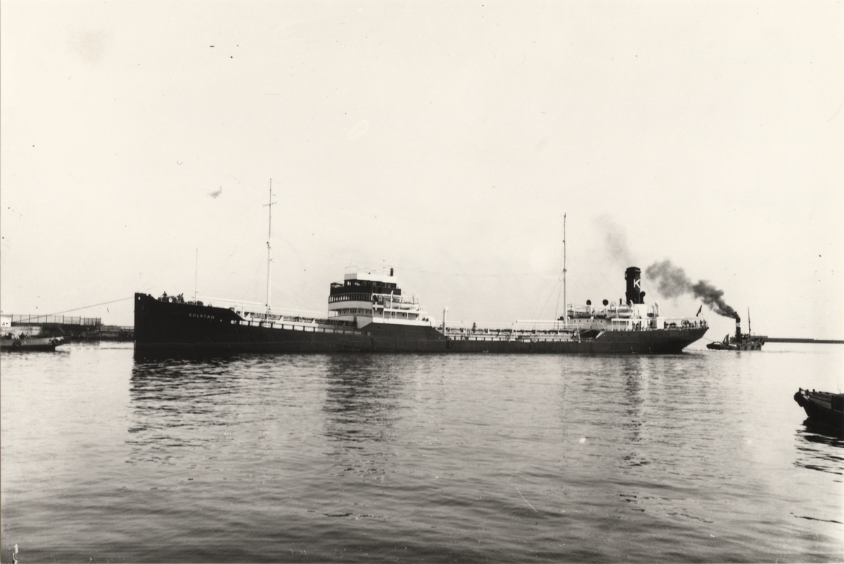 Foto i svartvitt visande tankmotorfartyget "SOLSTAD" av Oslo under bogsering i Köpenhamn under 1930-talet.