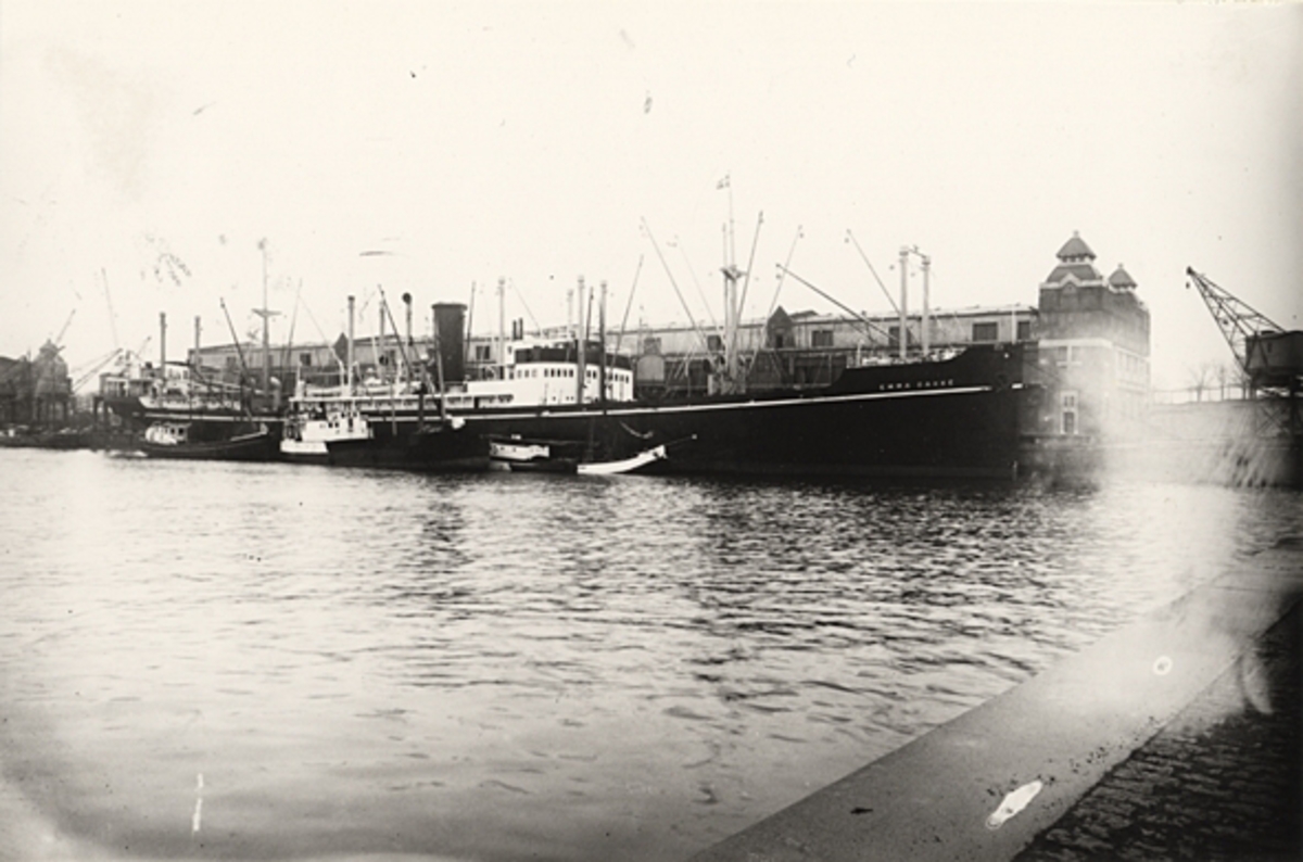 Fot i svartvitt vsande lastmotorfartyget "EMMA BAKKE" av Haugesund vid kaj i Köpenhamn under slutet av 1930-talet.