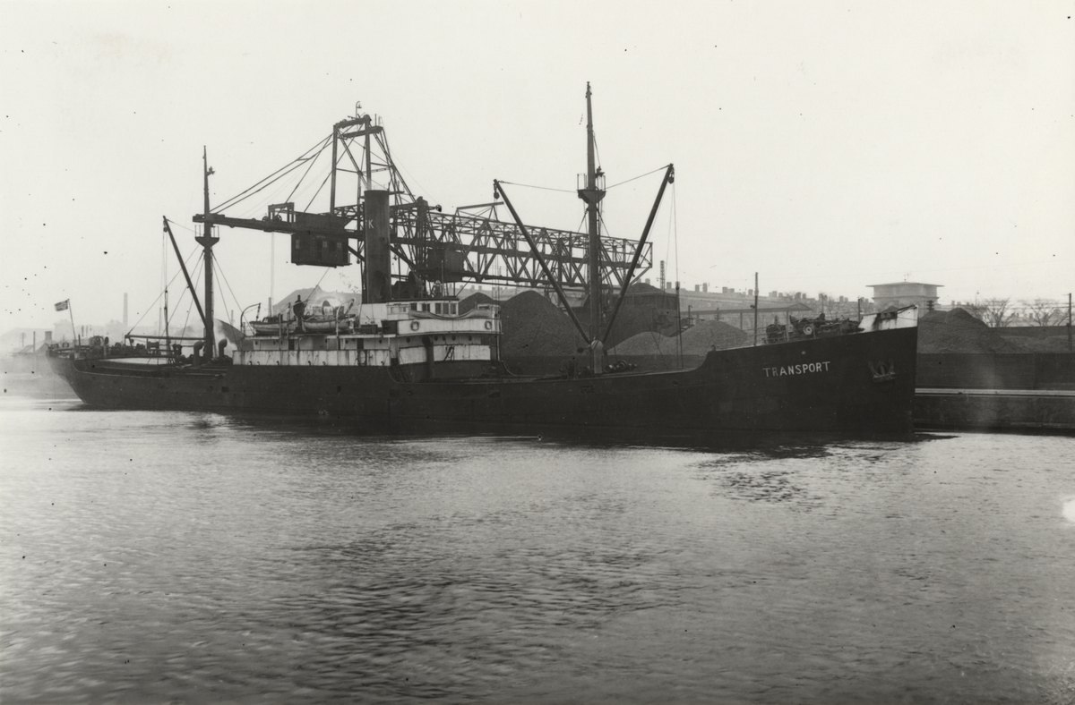 Foto i svartvitt visande lastångfartyget "TRANSPORT" av Oslo vid kaj i Köpenhamn under slutet av 1930-talet.