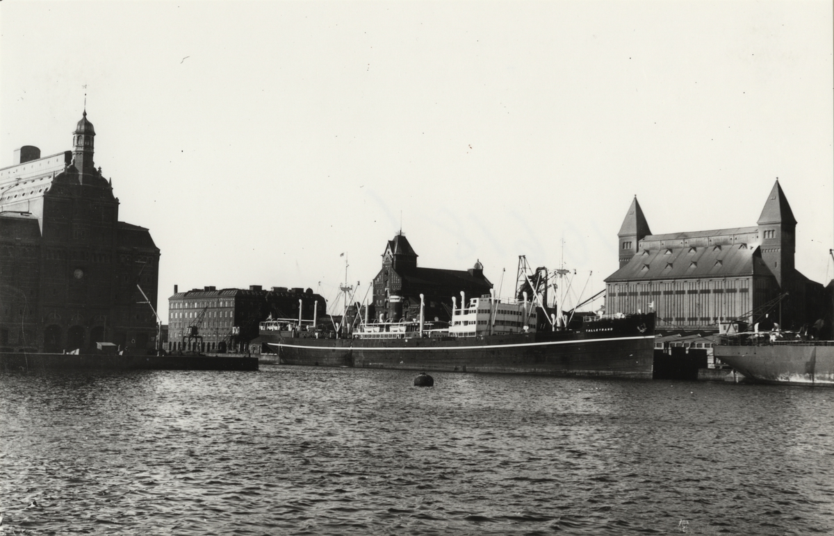 Foto i svartvitt visande lastmotorfartyget "TALLEYRAND" av Tönsberg vid kaj i Köpenhamn under 1930-talet.