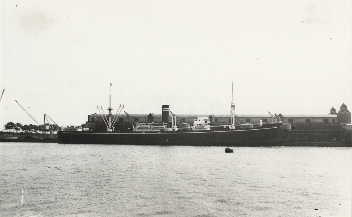 Foto i svartvitt visande lastturbinångfartyget "TANA" av Tönsberg vid kaj i Köpenhamn under 1930-talet.