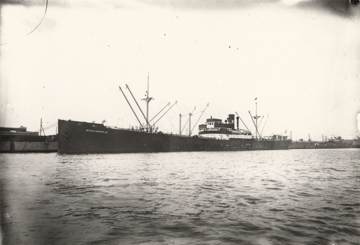 Foto i svartvitt visande lastmotorfartyget "STIRLINGVILLE" av Oslo vid kaj i Köpenhamn under senare hälften av 1930-talet.
