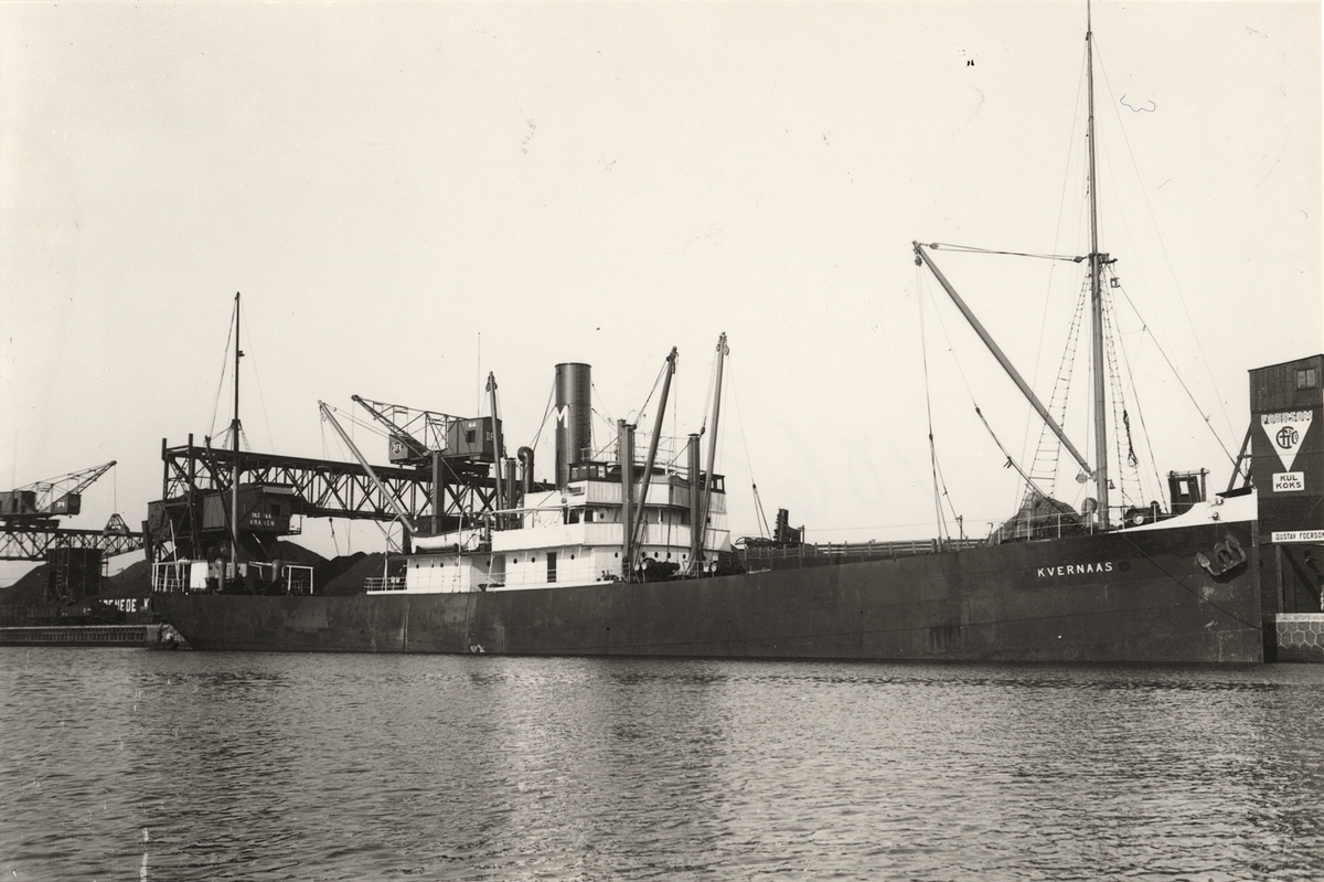 Foto i svartvitt visande lastångfartyget "KVERNAAS"av Arendal vid kaj i Köpenhamn under 1930-talet.
