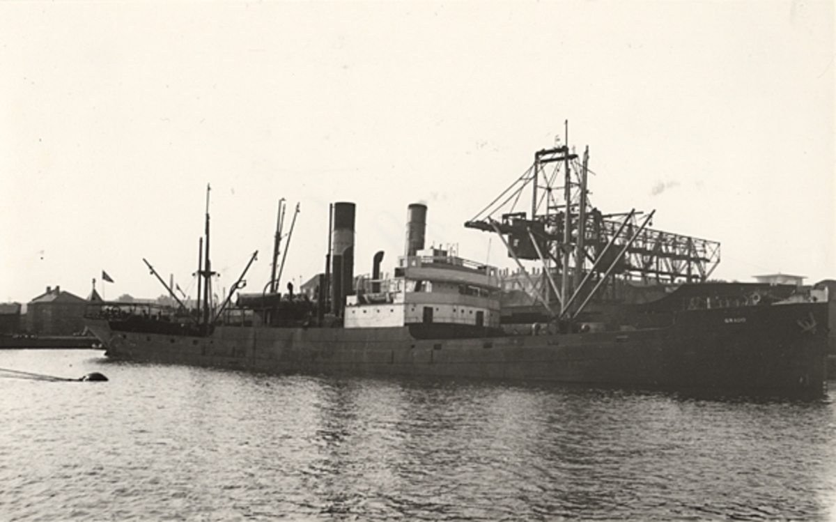 Foto i svartvitt visande lastångfartyget "GRADO" av Oslo i Köpenhamn under slutet av 1930-talet.
