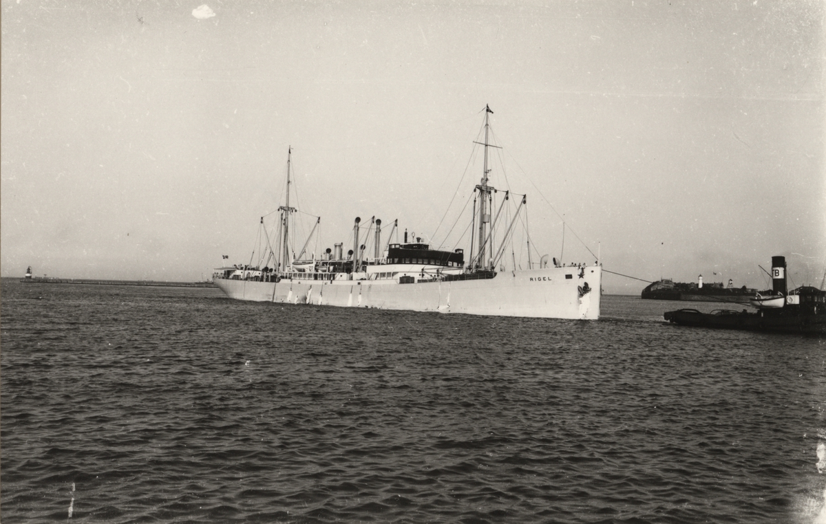 Foto i svartvitt visande lastmotorfartyget "RIGEL" av Bergen under bogsering i Köpenhamn, 1930-talet.