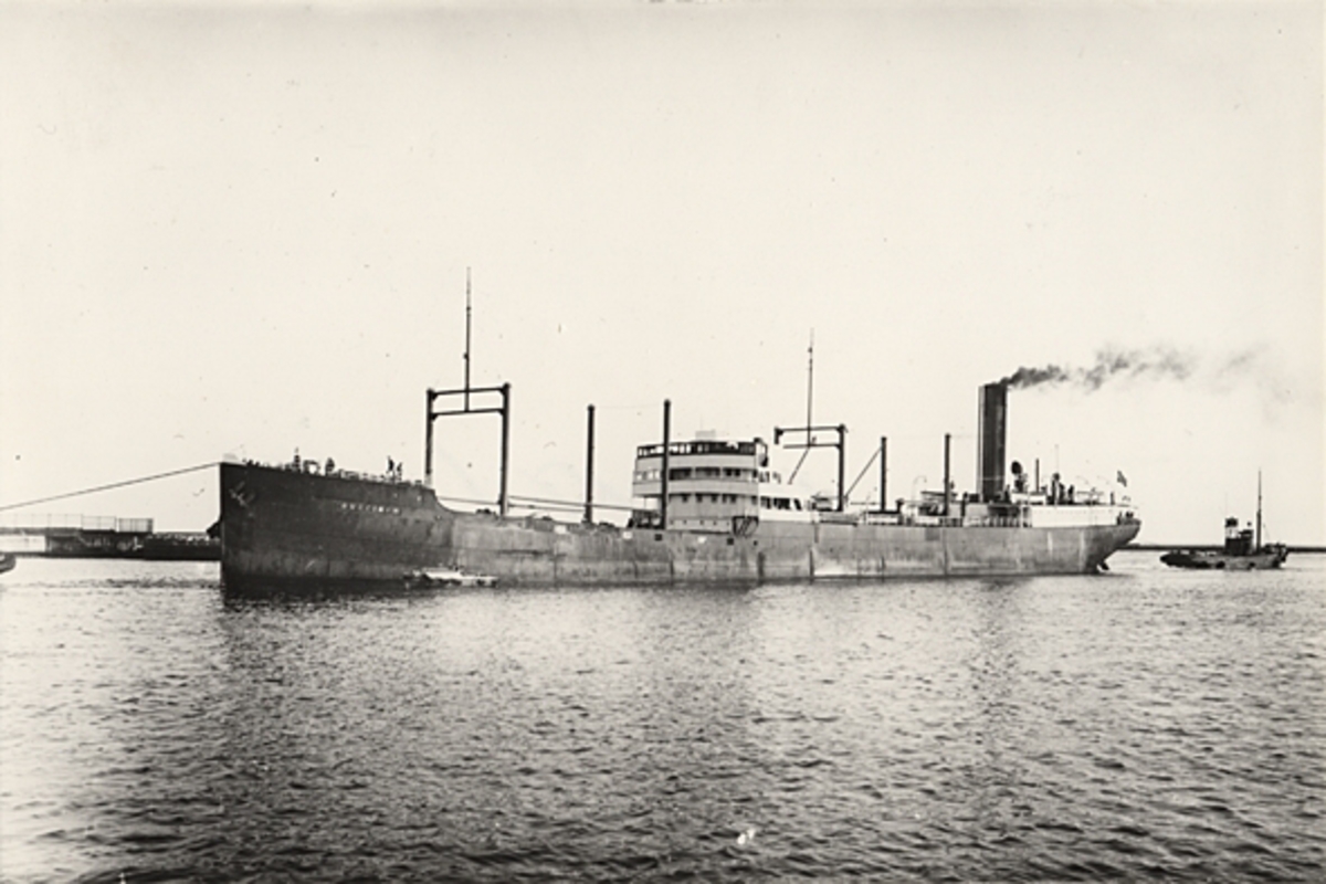 Foto i svartvitt visande tankångfartyget "BUCCINUM" av Arendal under bogsering i Köpenhamn, troligen under 1930-talet.