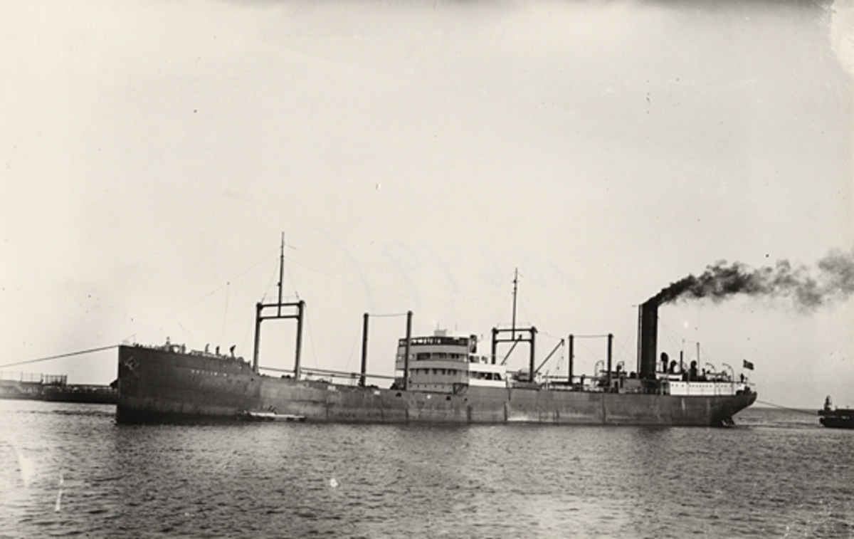Foto i svartvitt visande tankångfartyget "BUCCINUM" av Arendal under bogsering i Köpenhamn, troligen under 1930-talet.